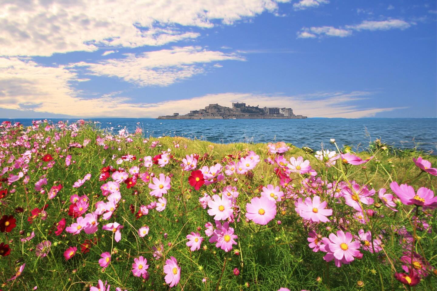 皆さんが見たい景色はこんな感じですか?.今まで撮った写真で作ってみました。.もちろん合成ですが、いつかこの景色を実現出来たらいいですね!.ドラマの影響もろに受けてます。見返した分新たな発見があるのも魅力ですね。.@hashima_since2025 さんのプロジェクト賛同します。.#端島 #軍艦島 #海に眠るダイヤモンド #端島炭鉱 #端島を舞台にしたドラマ #端島が見えるコスモス畑 #長崎